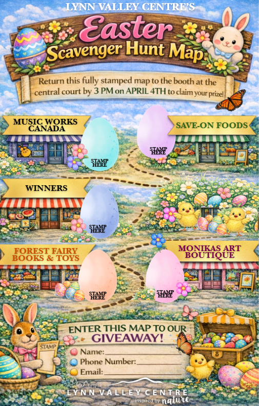 Celebrate Easter at Lynn Valley Centre with a fun-filled scavenger hunt, festive surprises, and family-friendly activities. Visit participating stores, collect stamps, and return your map for a chance to win exciting prizes! Join us on Saturday, April 4th from 12-3pm.